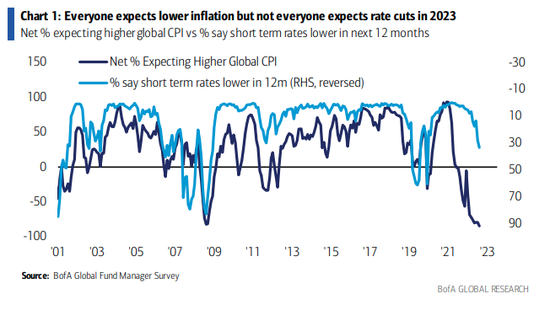美國銀行( 37.36 , -0.34 , -0.90% )最新的基金經理調查顯示,投資者預計通脹將在明年開始下降,但他們不相信這會與美聯儲降息同時發生。