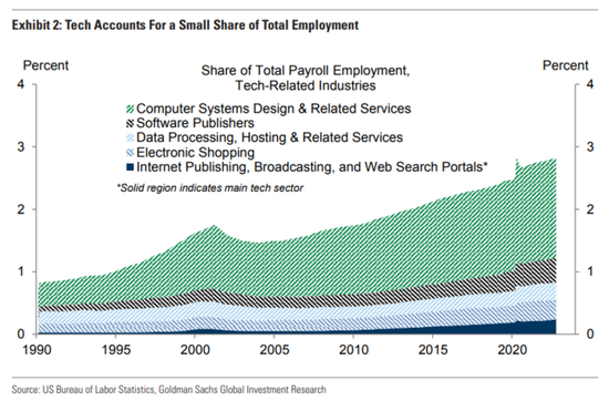 上文高盛稱,如果將「互聯網出版、廣播和搜索門戶」行業所有人解僱,失業率僅會上升0.3%,如果使用更寬泛的概念定義「科技」,那麼這個數位將小幅上升: