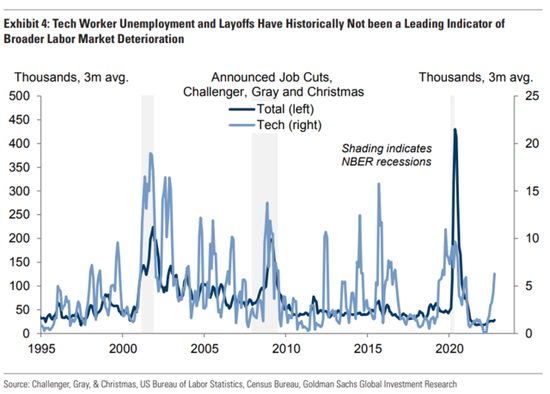 高盛表示,科技行業員工的裁員人數在過去經常激增,但整個勞動力市場的總裁員人數卻沒有相應增加: