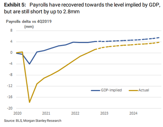 雖然這一數位可能是一個上限,因為它沒有考慮到大流行後世界生產力提高的潛力,但巨大的差距清楚地表明,就業水準仍然較低。