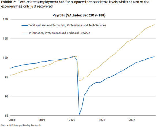 摩根士丹利經濟學家Julian M Richers等人認為,美國科技行業此前的招聘規模和速度位居全行業前列,而此次裁員浪潮是應對經濟環境波動的正常現象; 另一方面,即使大規模招聘,科技從業人員實際上佔全美勞動人口比例並不高。