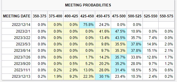 隨著通脹飆升,美聯儲轉向了激進的加息——最近四次加息均為75個基點,將聯邦基金利率提升至3.75% - 4%的區間。 目前,利率期貨市場對於本輪加息週期的利率峰值預期區間集中在4.75%—5.25%,美聯儲在今年12月可能放緩加息步伐,加息50個基點概率接近80%。