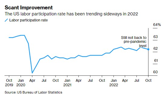 至於歐元區,失業率正處於單一貨幣歷史上的最低水準。 儘管經濟衰退可能正在進行,但歐盟10月底發佈的官方預測顯示,就業增長將持續到2024年,儘管2023年將出現明顯放緩,失業率只會溫和上升。 官員們將這歸因於政府採取的支持就業措施,以及人口老齡化。 貌似合理的做法是,加強對歐洲員工的保護,限制企業裁員,可能也會有所説明。