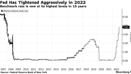 根據期貨市場合約定價,市場投資者預計美聯儲下個月將放緩加息步伐,並預期明年利率水準將從目前的3.75-4.00%升至5%左右的峰值。