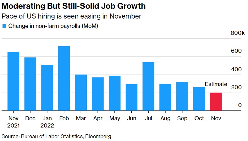 市場預計美國11月失業率約為3.7%,和上個月基本持平。 非農就業報告預計還將顯示平均時薪增長幅度趨於放緩,調查顯示分析師中值預測為4.6%(年增長率),這將是自2021年8月以來的最小增幅,對美聯儲政策制定者來說可謂是“朝著正確方向邁出的一大步”,這將進一步強化市場對於美聯儲明年第一季度“轉鴿”——即暫停加息進程的預期。