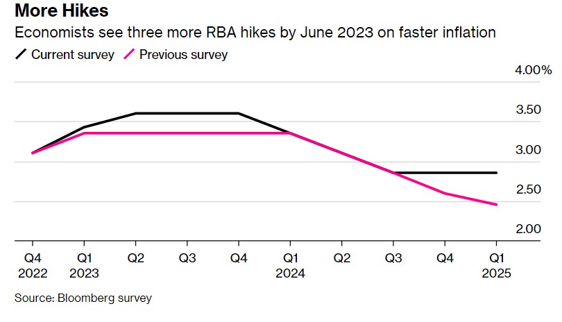 經濟學家預計,到2023年6月,隨著通脹加速,澳聯儲還將加息三次