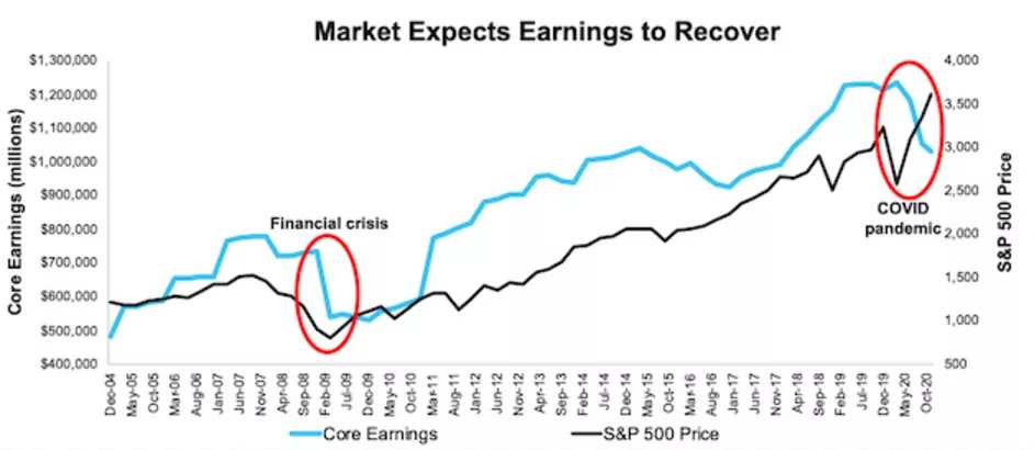 當前危機期間市場的反應與2008年金融危機期間十分不同。當時,標普500指數隨著企業核心收益的下滑而大幅下跌,直到2009年第二季度,也就是核心收益觸底的時候,才出現反彈。而現在的情況是,核心收益尚未見底,而美股已市場飆升至歷史高點。