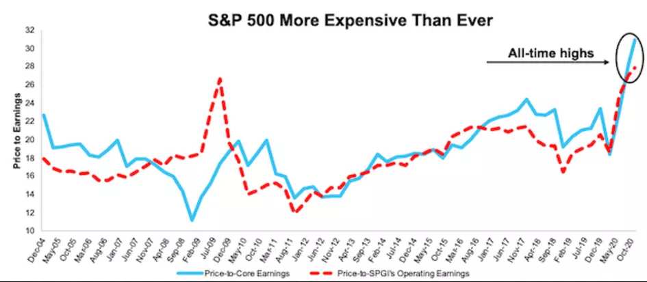 從外媒對標普500指數2020第二季度實際核心收益的分析中,可以注意到一個情況:企業收益的急劇下滑並沒有阻止該指數的估值達到歷史新高。
