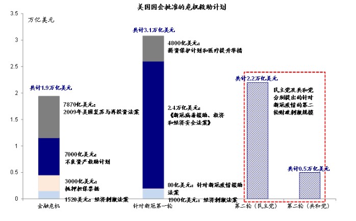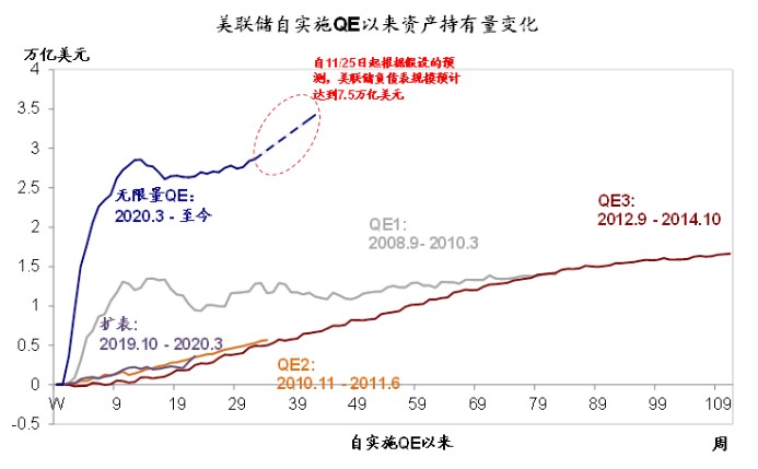 i. 更長時間內維持寬鬆,但短期加碼也似無必要。此次FOMC會議最大的變化就是把QE的指引從此前的時間指引“未來數月(over coming months)”改為目標指引“直到充分就業和通脹目標實現重大進展(substantial further progress has been made)” 。這一修改的目的和好處,說白了,就是要錨定在更長時間內維持寬鬆的市場預期,打消關於可能短期內退出的擔憂。這一點,與此前美聯儲將價格端的加息指引調整為“平均通脹目標制”(即短期以實現充分就業為更重要的目標來決定加息時點)如出一轍。按照這一路徑,我們測算2021年底,美聯儲資產負債表有望增加至7.5萬億美元左右。