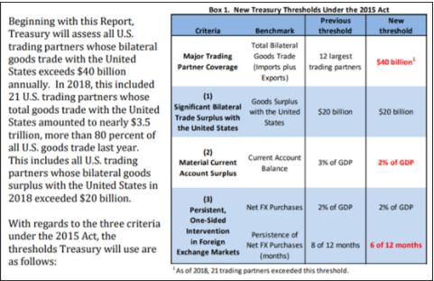 美國使用三個標準來評估一個國家是否操縱匯率:一是對貨幣市場的積極干預程度;二是對美貿易順差的規模;三是該國經常項目盈餘的規模,包括投資收入和其他資金流動。如果滿足三個條件中的兩個,就將被列入觀察名單。