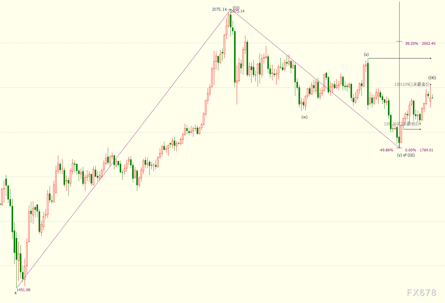 日線圖上看,金價自1764美元開啟上行((iii))浪走勢,(i)浪是((iii))浪的子浪。((iii))浪的23.6%和38.2%目標位分別在1911美元和2002美元,((iii))浪是自1451美元開啟的上行5浪的子浪。