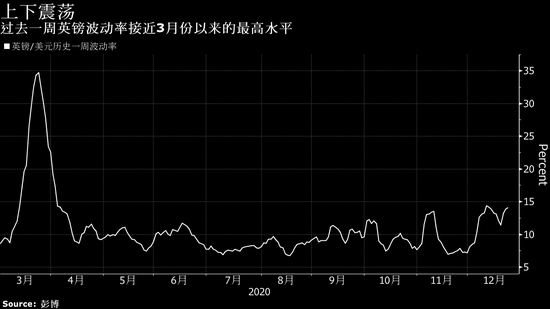 隨著商談協議的時間逐漸耗盡,英鎊目前走勢已然震盪。過去一周的波動率接近3月份新冠疫情席捲全球金融市場以來的最高水平。波動率高達14%,幾乎達到歐元/美元波動率的一倍。其隱含波動率超過了除巴西雷亞爾和土耳其里拉之外的其他所有貨幣。