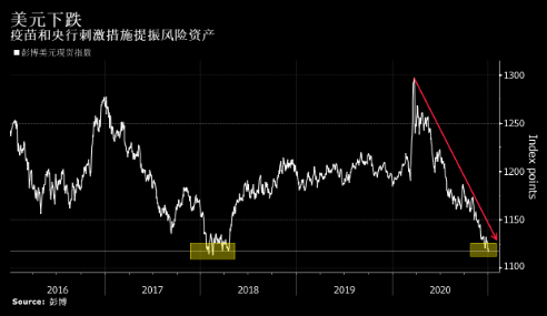 彭博美元現貨指數週一下跌0.5%,觸及2018年2月以來的最低水平。2020年該指數下跌5.5%。商品期貨交易委員會的數據顯示,12月份的倒數第二週,美元的投機性空頭頭寸接近十年來最高。