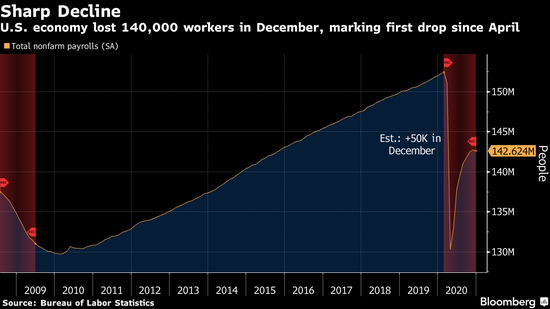 美國勞動力市場復甦勢頭在12月陷入停頓,非農就業人數八個月來首次下降,因新冠感染人數激增對就業打擊加重,並危及經濟進展。
