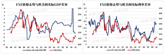 Rothko Research表示,影響FXE走勢的因素有歐洲各國央行資產負債表的年度變化,以及歐元區和美國之間的實際GDP差異和實際利率差異。