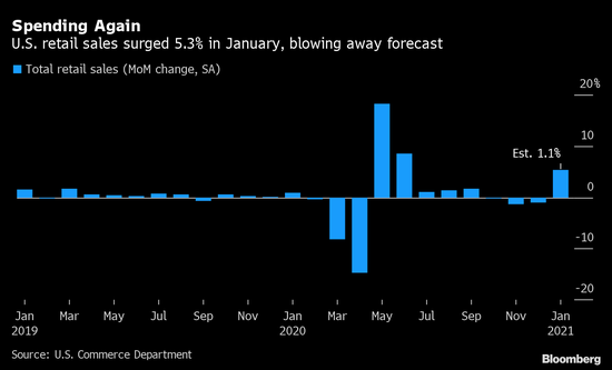 美國1月零售銷售創下七個月來最大增幅,表明得益於政府應對疫情影響的紓困支票等因素,家庭需求繼第四季度表現疲軟後出現反彈。