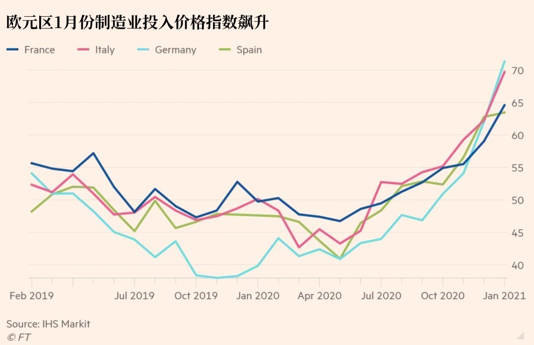 IHS-Markit採購經理調查顯示,歐元區製造商的投入品價格本月以近10年來前所未有的速度上漲。汽車、化工、金屬和採礦、資源和基礎材料行業受到的影響最大。