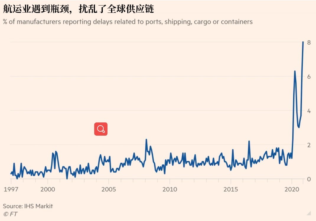從半導體到鋼鐵等許多原材料產品的短缺,導致一些製造商產出減少,無法滿足不斷增長的需求。另外由於貨物供不應求,運輸壓力較大,交貨時間大大延長。