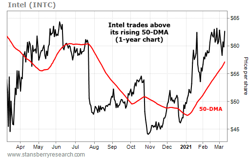 正如下圖所示,英特爾在過去的一年裡一直不穩定。股價多次從45美元左右飆升至略低於65美元。而且其價格也經常越過50天移動價格平均線(50-DMA,紅線)。