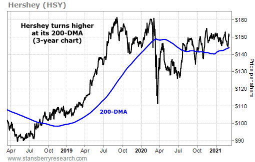 最近,好時攀升至200日移動平均線(200-DMA,藍線)上方。2020年12月,好時股價200日DMA開始轉漲,近日股價短暫下降到這個關鍵的“支撐”水平又轉高。