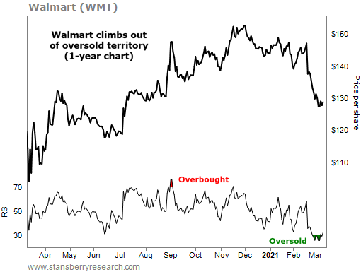 在上圖中,我們看到沃爾瑪的大幅下跌將其RSI推至25.5。近幾個交易日,沃爾瑪已經穩定下來,其RSI已經攀升到超賣之上。