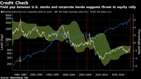 花旗表示,投資級債券收益率和標普500指數盈餘收益率之間的差距,觸及歷史上預示著美國股市疲軟的水平。花旗首席美國股票策略師Tobias Levkovich週一在報告中寫道,目前該差距高於其五年滾動平均值兩個標準差,這“通常暗示股市勢將回撤”。Levkovich說:“過去,在這樣的節點都目睹了股價回調”。