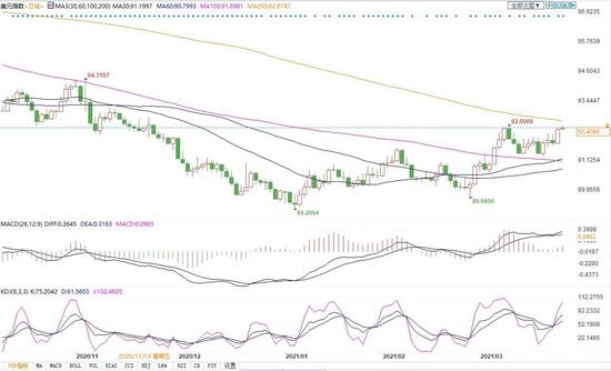 因為美聯儲主席鮑威爾向國會表示,通脹會上升但不會失控,3月23日美國國債收益率下滑,美元指數上揚,升穿兩周高位,進入3月24日亞市早盤再次刷新兩周高位至92.44。