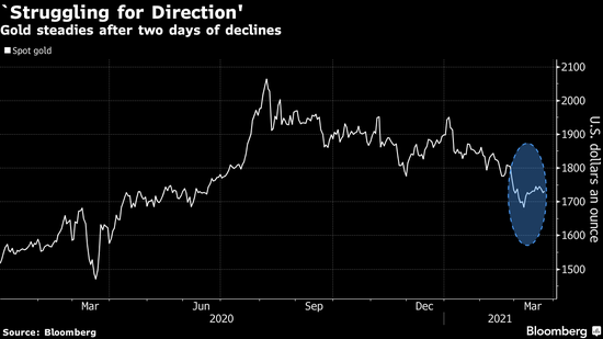 金價在下跌兩天之後企穩,美聯儲主席鮑威爾淡化對通脹失控的擔憂後,交易員等待新的美債拍賣結果。