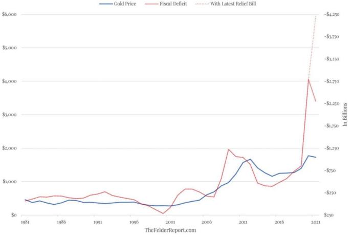 假如財政赤字目前正像十年前走出經濟衰退時那樣處於見頂階段,那麼黃金牛市可能快要結束了。然而,如上面的圖表所示,黃金價格可能甚至還沒有完全對去年的財政赤字定價,更不用說今年美國財政赤字的規模將無比龐大。此外,Jesse Felder發現,美國經濟學家淡化了對財政赤字的擔憂,意味著民眾會長期支持黃金。
