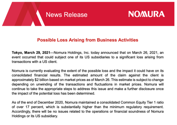 今天事件進一步發酵,國際投行野村、瑞信雙雙發佈「虧損」公告,直指Bill Hwang。