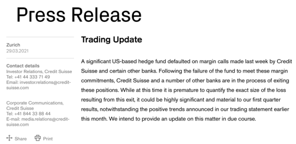 同日,歐洲投行瑞信也發佈公告,上週一家位於美國的對沖基金爆倉。瑞信和其它銀行正在試圖退出這些股票倉位。儘管目前尚不能量化這次事件導致的虧損,但是很可能由此對瑞信一季度(財務數據)產生重大影響。