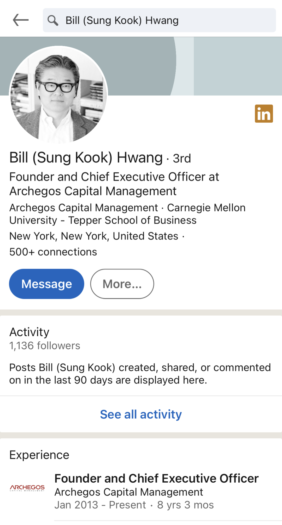 領英上的資料顯示,Bill Hwang畢業於美國卡耐基‧梅隆大學的泰珀商學院,後供職於大名鼎鼎的對沖基金老虎基金。據瞭解,老虎基金創始人Julian Robertson頗為賞識Bill Hwang。在後者的支持下,他創立了老虎亞洲基金管理。