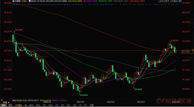 一度跌至92.528,為3月25日以來的最低水平。不到一周之前,該指數曾觸及近五個月高點93.439點。但在歐市盤中,隨著國債收益率企穩,美元整體人氣轉好。