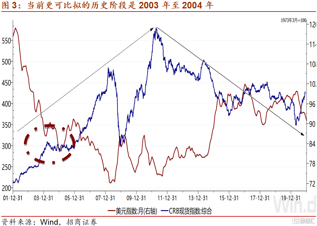 從圖中可見,當前美元初步出現的弱勢與全球美元信用初期的擴張勢頭均已出現,未來將進入一個自我加強的過程。市場流行的觀點將2021年的經濟比擬為2013年美聯儲收縮開始期,我認為完全錯誤,更為合適的比擬是平均17年時長美元週期指向的2003至2004年。