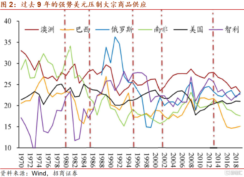 下圖可見,在美元處於強勢的1980至1985年,1995至2002年和2013至2020年,典型大宗商品生產國如澳大利亞、巴西、俄羅斯、南非和智利等國的資本形成與GDP之比均出現明顯的下行趨勢。