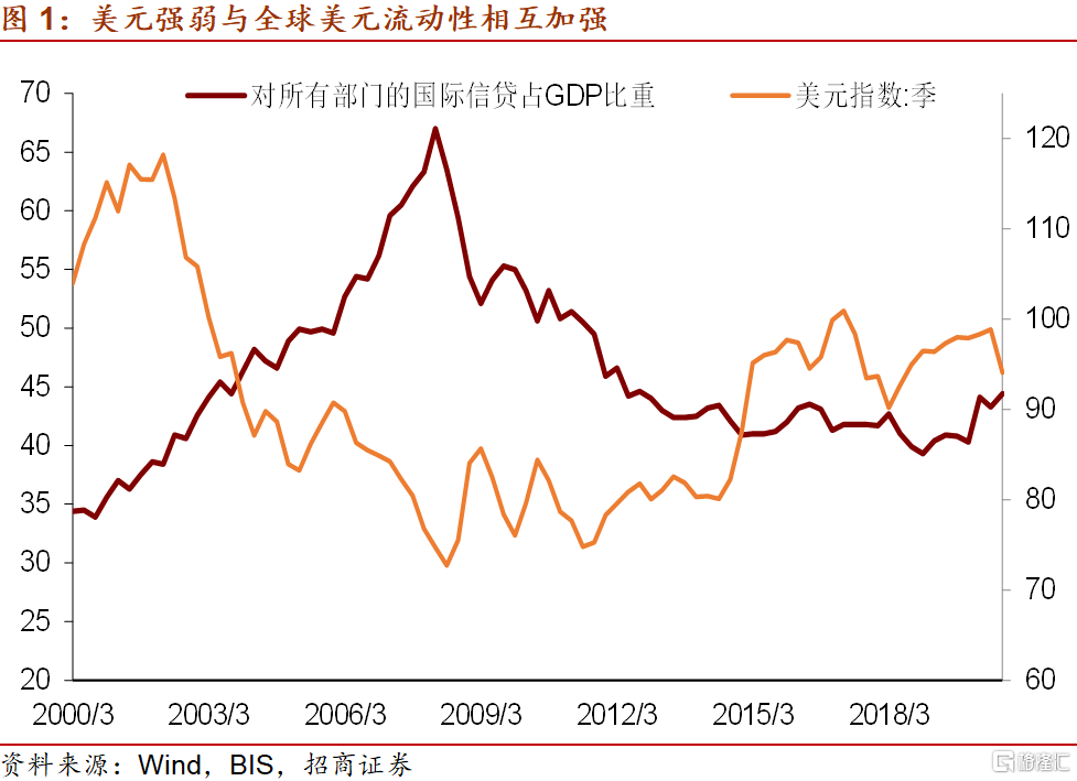 從下圖可見,美元的強弱與全球美元信用(商業銀行對所有部門的國際信貸佔GDP的比重,來自國際清算銀行)之間存在一個互相加強的關係,美元走弱帶動美元信用擴張,美元信用的擴張通過增加美元供應帶動進一步的美元走弱,這樣的進程上一次出現在2002年至2007年,正是大宗商品牛市的主升階段。