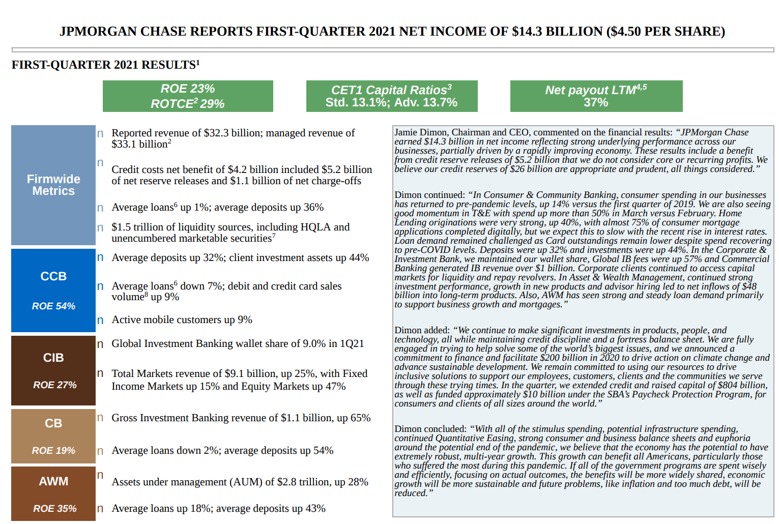 摩根大通董事會主席兼CEO傑米·戴蒙在聲明中表示,公司一季報展現了整體業務的強勁表現,其中也受到經濟快速回复的驅動。我們認為目前公司260億美元的信貸撥備是審慎且適當的。