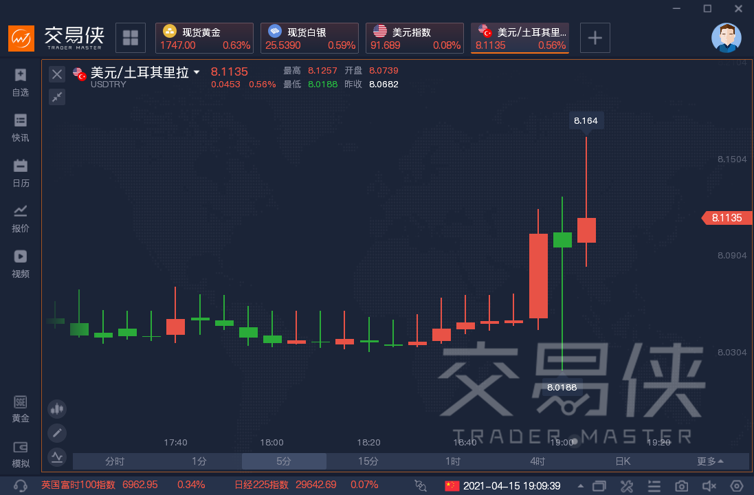 週四晚間,土耳其央行公佈利率決議,這次該央行按兵不動,維持利率水平在19%不變。隨後,美元兌土耳其里拉出現劇烈波動,先是短線跳水,跌至8.01附近;然後又快速拉升,短短幾分鐘內波動幅度超1500點。