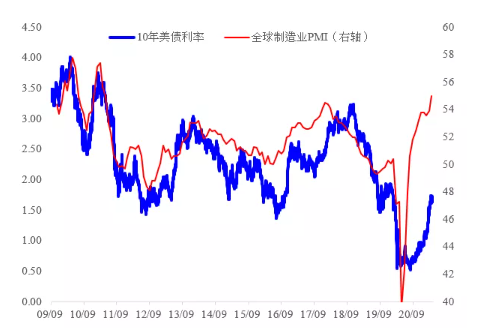 從10年美債的驅動看,儘管美債收益率是美國的債券利率,但它對全球的製造業景氣度有著較高的相關性和敏感度。這與美債作為全球無風險利率的定價錨定有關係。或者說,當全球製造業景氣度向上時,全球對美債的需求會降低,反之增強。