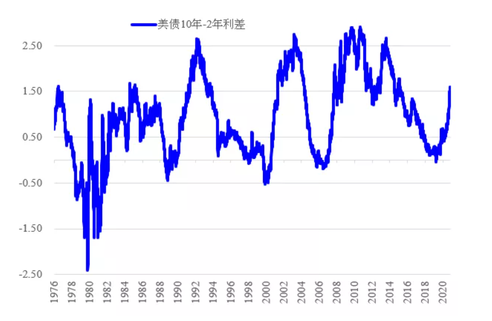 10年- 2年的美債期限利差,是表徵美債曲線陡峭程度的指標,也是反映市場如何評估美國經濟中長期增長動力的指標。我們看到歷史上,美債期限利差在經濟復甦階段進入到熊陡上限的利差水平,主要在1.5%-2.5%這個區間波動。目前這一利差在1.5%附近。