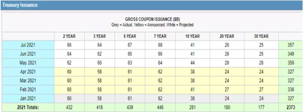 除了上文提到的基本面因素以外,美債發行量的不斷增加也是從供需層面支撐收益率上行的關鍵變量。通過CME Treasury Watch工具,我們可以獲得下表具體各個期限的美債發行規模,從供需層面分析美債收益率的走勢。