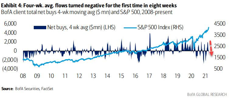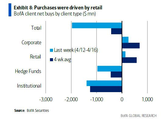 美銀報告中還值得一提的是:機構和對沖基金客戶已經拋售並且已經拋售了幾週,而散戶是上週的唯一買家,並且連續第八週買入。