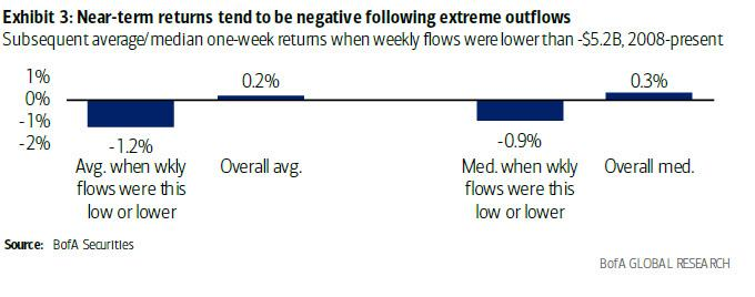 根據以前週度資金流數據出現此等規模流出之時的市場表現,美銀計算得出,次週的平均回報(中值)為-1%,錄得負回報的概率為75%。
