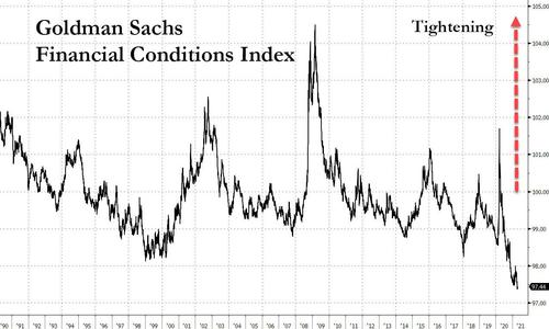 高盛( 339.35 , 8.50 , 2.57% )的金融狀況指數來到創紀錄低位,表示美國金融狀況異常寬鬆。