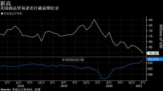 美國3月商品貿易逆差刷新紀錄,進口額創出新高。