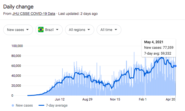 根據巴西衛生部發布的數據,截至當地時間5月5日19時,巴西累計新冠肺炎確診病例14930183例,較前一日新增73295例;累計死亡病例414399例,較前一日新增2811例。