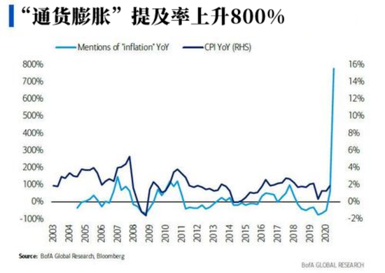“從絕對角度來看,通貨膨脹提及率從2011年開始飆升至接近歷史最高水平,未來將出現暫時性的'惡性通脹'。”