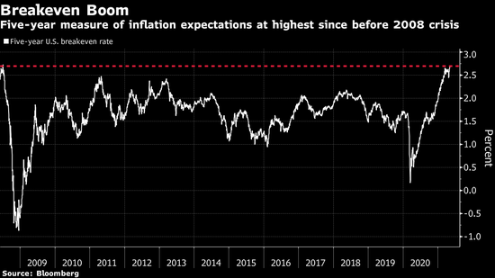 週三,5年期盈虧平衡通脹率突破2.7%,創下2008年7月以來的最高水平。此前,美國財長耶倫談及加息引髮美股大幅調整。隨後耶倫態度軟化,馬上澄清未暗示美聯儲采取行動。荷蘭合作銀行策略師Richard McGuire表示,盈虧平衡通脹率的上漲反映出市場被不確定性籠罩。