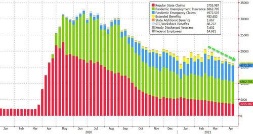 從失業金續請人數來看,雖然上周繼續申請失業救濟的人數溫和增長(只從365萬增加至369萬),但領取失業救濟的美國人人數仍然超過1600萬。