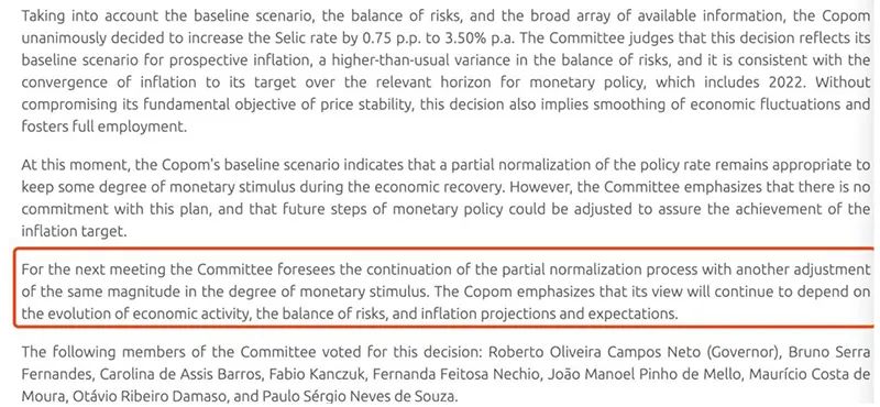 巴西央行貨幣政策委員會在貨幣政策聲明中稱,疫苗接種預期下,全球經濟迎來復甦,通脹上升預期為新興經濟體經濟復甦帶來挑戰,主要是當前食品和工業品價格上漲所致。